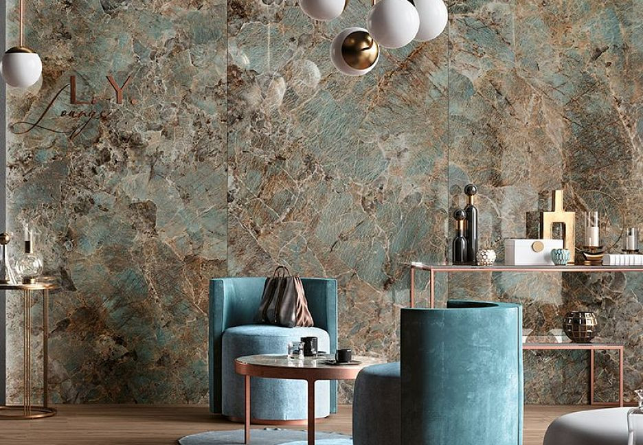 Керамогранит 280x120 Amazzonite Lucido Cosmopolitan глянцевая голубой мрамор 6мм Mirage